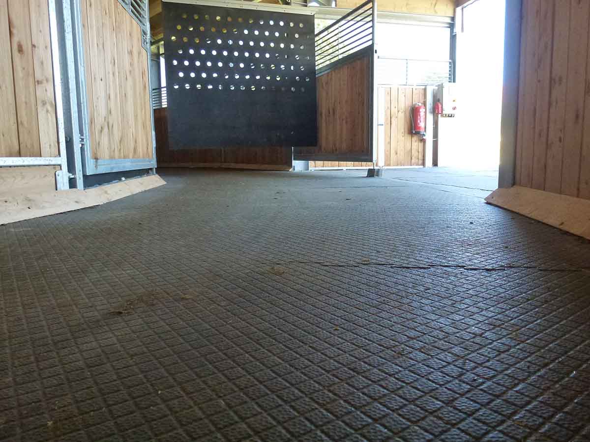 Je nach Beschaffenheit des Untergrundes empfehlen wir die Verwendung von Gummimatten oder Ecoraster-Bodengitter. Beide Produkte werden individuell auf die Größe Ihrer Führmaschine zugeschnitten. Zudem erfolgt die Verwendung sowohl für offene als auf für gedeckte Anlagen.